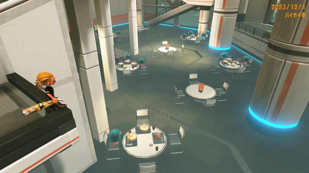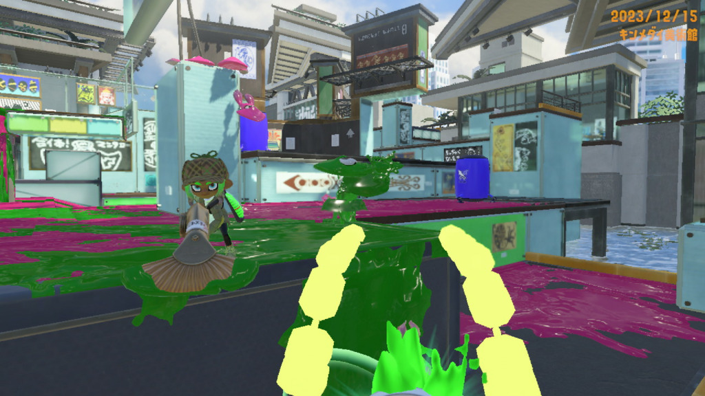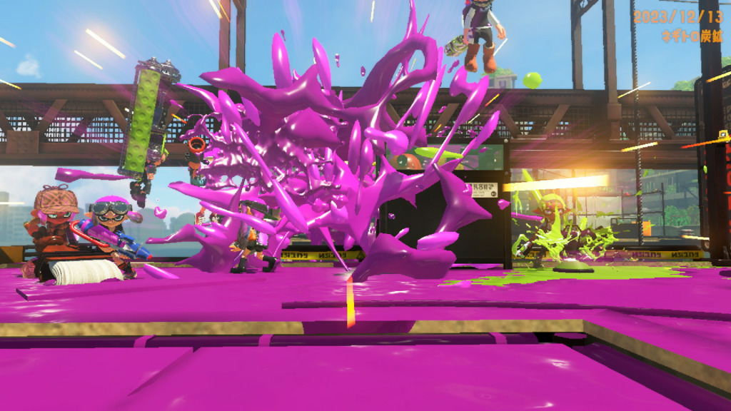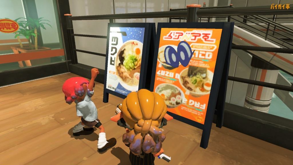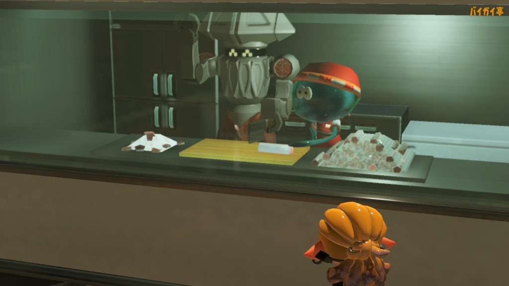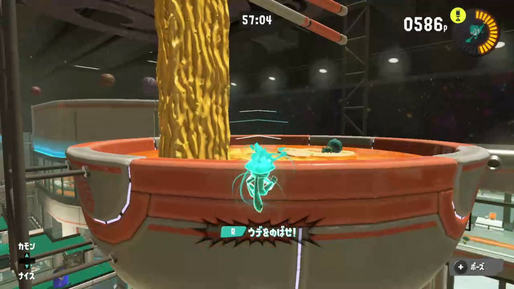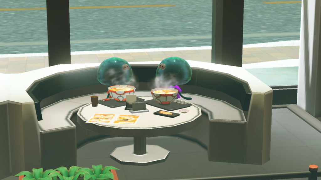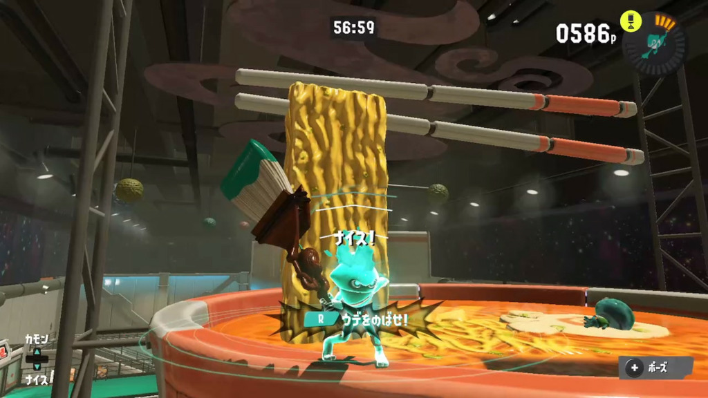 ラーメンを貫くヤグラの光 ナルトを切るロボイカちゃんと支えるクラゲちゃん(反対側はキャベツだったよ) 無限にぶつかり続けてるロボイカちゃん ラーメンガン見 スープに飛び込んだら即死扱いなのか発動場所に返されました