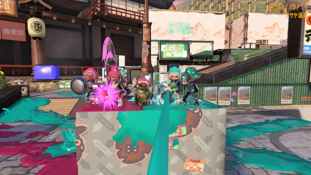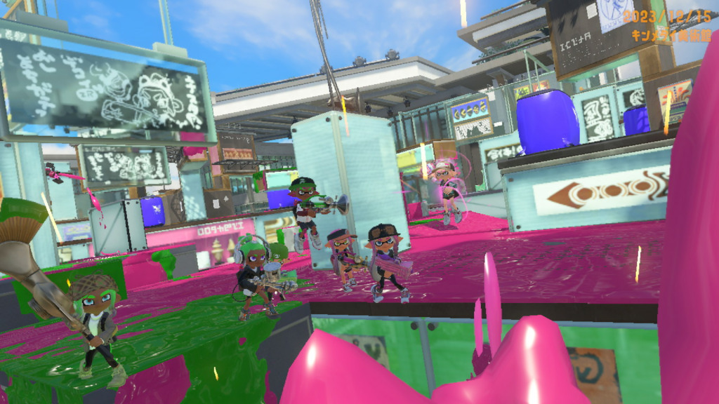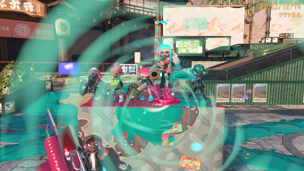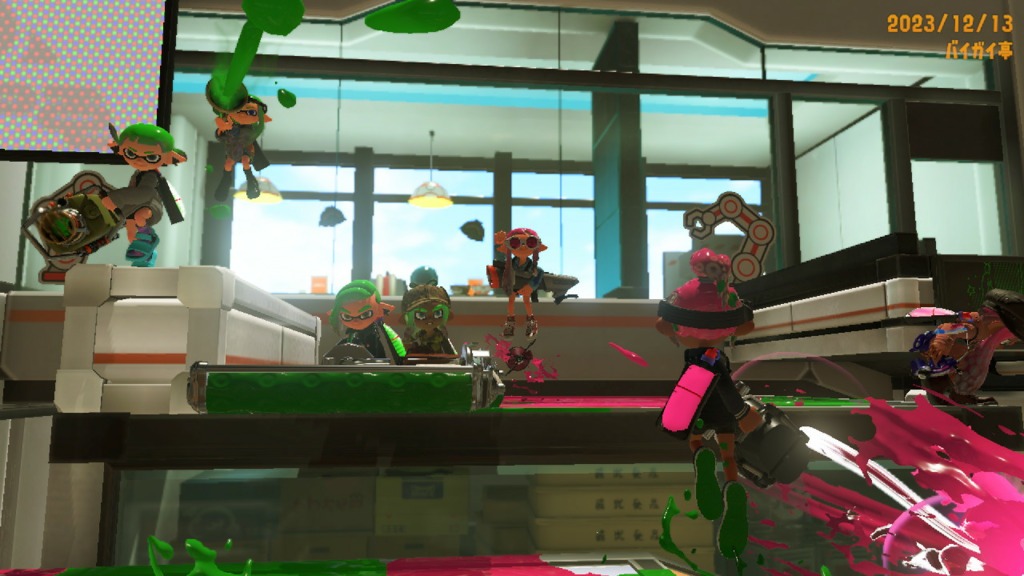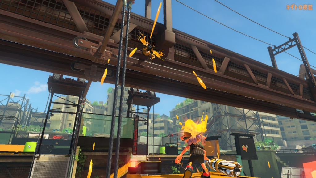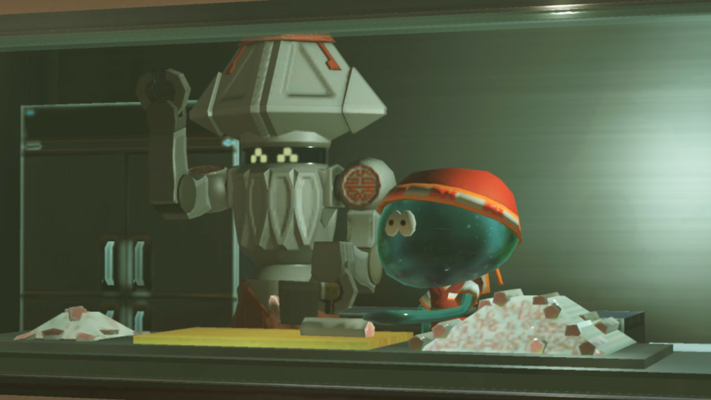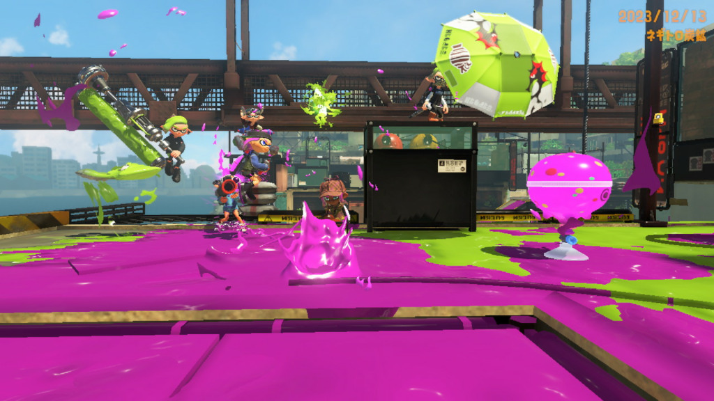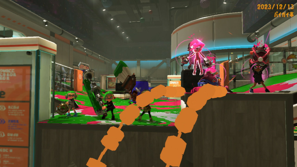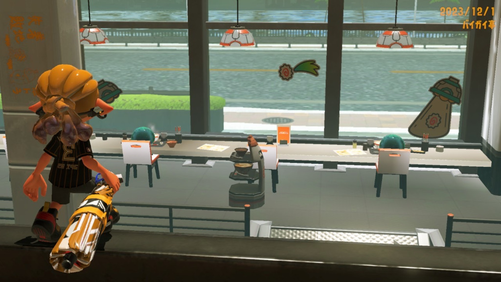ラーメンを貫くヤグラの光 ナルトを切るロボイカちゃんと支えるクラゲちゃん(反対側はキャベツだったよ) 無限にぶつかり続けてるロボイカちゃん ラーメンガン見 スープに飛び込んだら即死扱いなのか発動場所に返されました