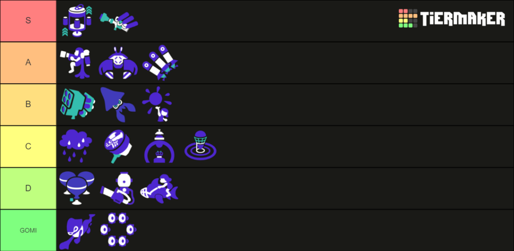 トルネードは個人的にBの1番下ぐらいかな。あとグレバリはCの1番上でも良いかも。メガホンはデコイとキューインキの間でも良いかも。 てか誰かスプラ3のTier表の作り方教えてくださいお願いします。