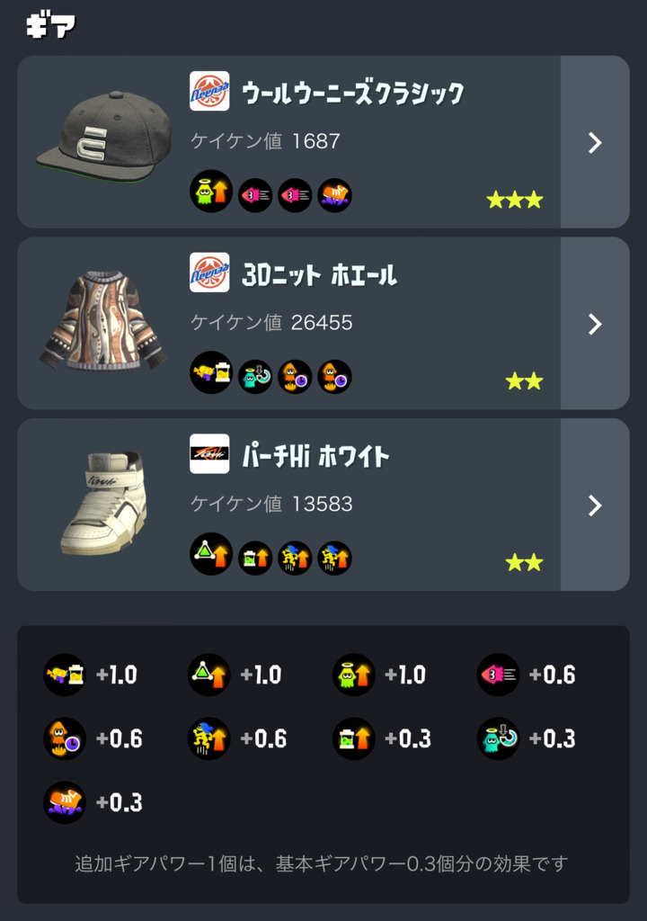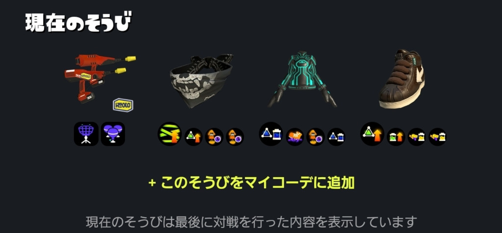 とりあえず手持ちのギアで組んだのでアク強とイカ速ひとつずつ増やす予定。