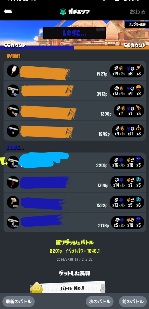 塗り進みバトル、 逆境スぺ増ガン積みで塗り3000いけるんじゃないか ステジャン付けて2800行ったから多分達成できるんだよな
