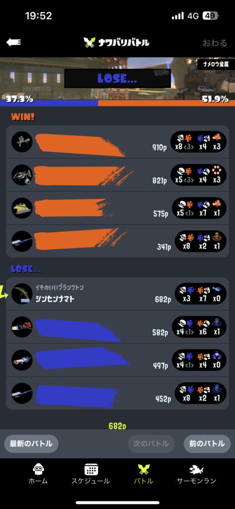 ナワバリにキルブキ持ってきてるならキル取ってお仕事してください塗るのはこっちが全部やるのでって思う塗りブキメインで使うイカ 個人的にはチャーどもが勝手に睨み合ってる間に塗りたいけどこの編成じゃきつそうだよなぁ
