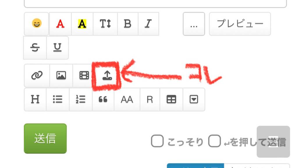あとアップロードボタンで画像貼るときは下のコマンドボタンの1つの「折りたたみ」で画像を隠しといたほうがいいよ サーバーの負担削減のためだったと思う