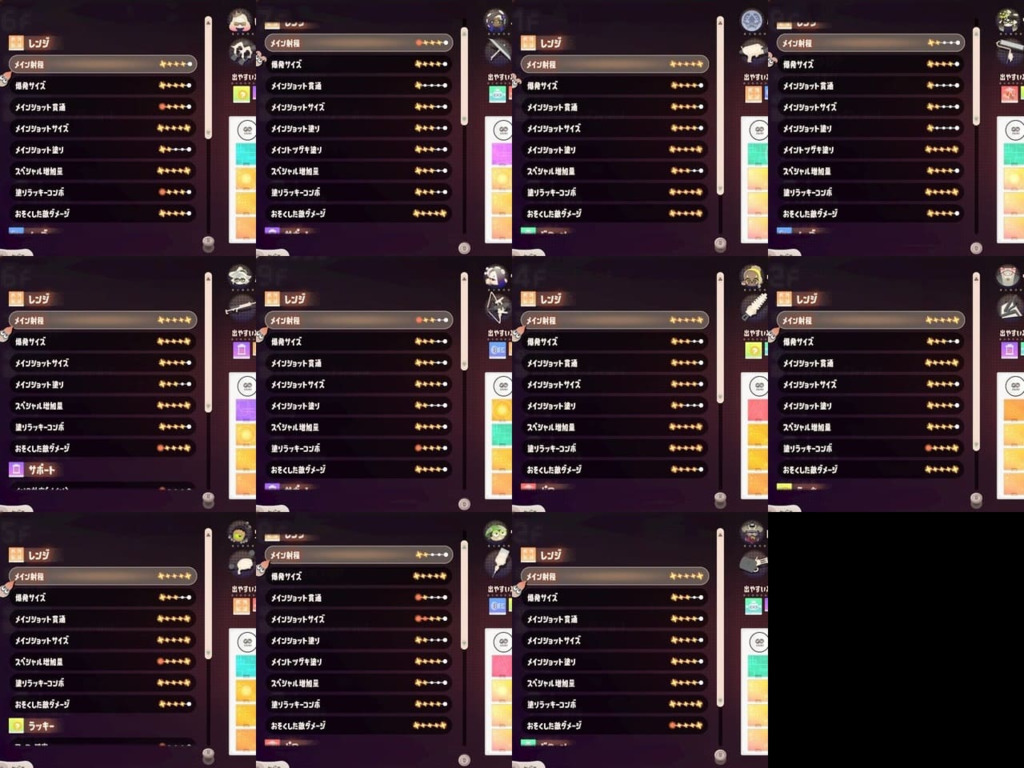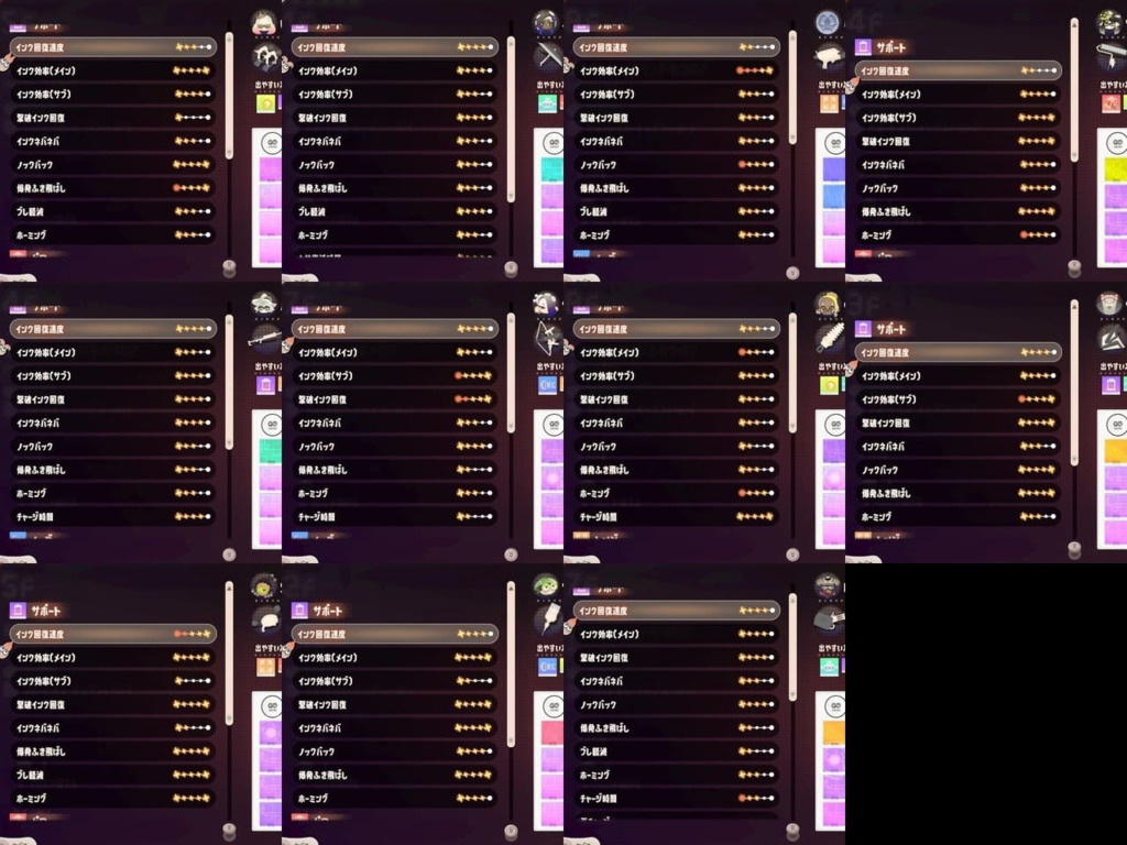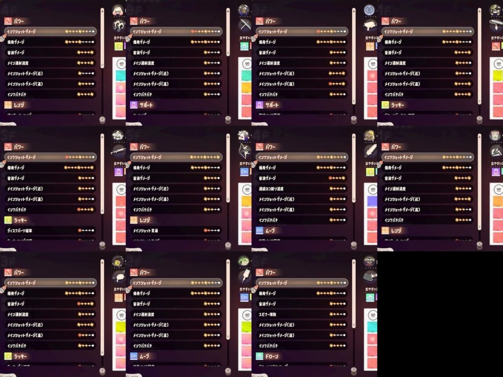 検証の内容は、「11個のパレット=全ブキ種で1F~9Fを周回し、パワー・サポート・レンジ・ムーブカラーチップフィーバーを発生させる」というものです。