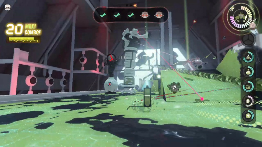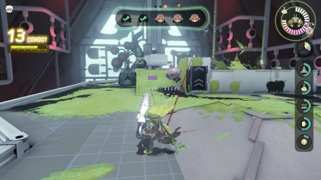 まさかの3つ目もエリア。 射程チップを2,3枚取ったチャージャーですら、エリアにあまり届かない(はず)非常に難しい2ステージ。 まるで下層の「いったりきたりのフロア」の強化版。 滑空を駆使してエリアに移動して、カプリチョーソ(空を飛び塗ってくる敵)を倒しまくろう。 アルペジオは無視して進もう。