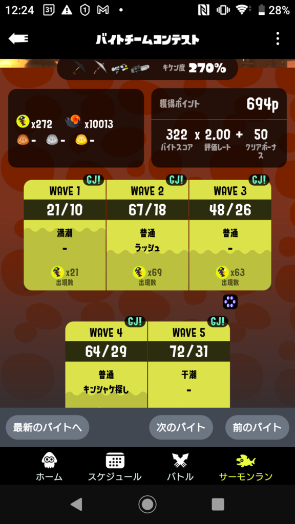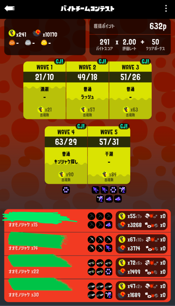 シャケ共の湧き場所を暗記しないといけないし、編成のブキ理解が必要だし、インク無駄に使えないし、味方が自分の思い通りに動くとは限らないし、今回はタマヒロイの風向き悪かったから神経使うし、テイオウはヘビに弾かれるし、wave3はなんかムズいしで大変だった