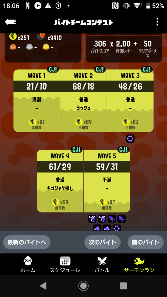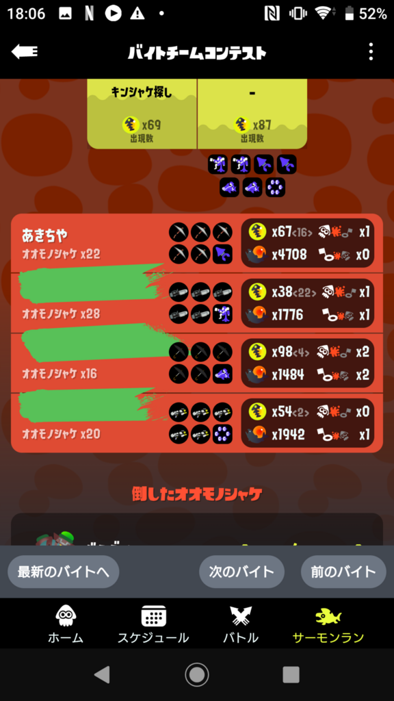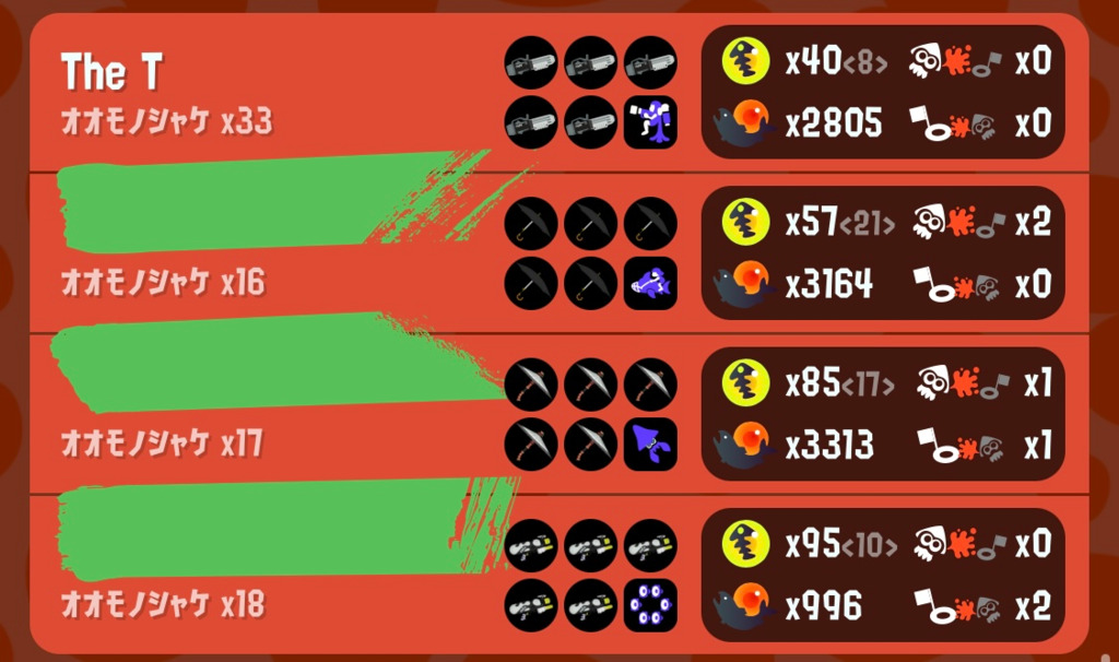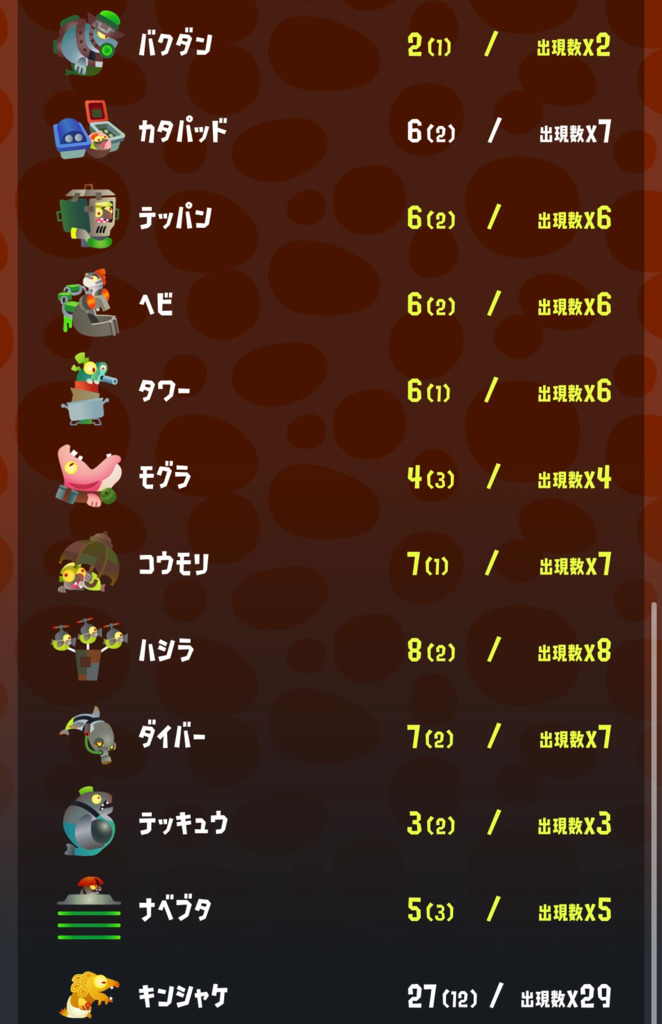 今回の通常シフト、スクスロ役の理解度でハシラ雑魚シャケ狂シャケ辺りの処理力がえらい乱高下してます。