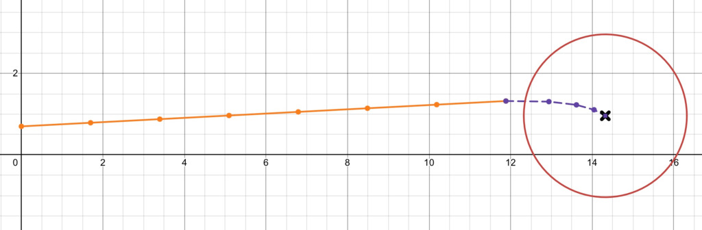 とある方のグラフを借りて、弾速が10.5%ほど遅くなった長射程モードの弾道を計算してみました。 左が現在、右が弾速を遅くした方です。 1Fだけ届くのが遅くなっています。射程は変えていません。 ※初速(オレンジ色):17.0→15.2 直進終了時最大速度(紫色):16.5→約14.7