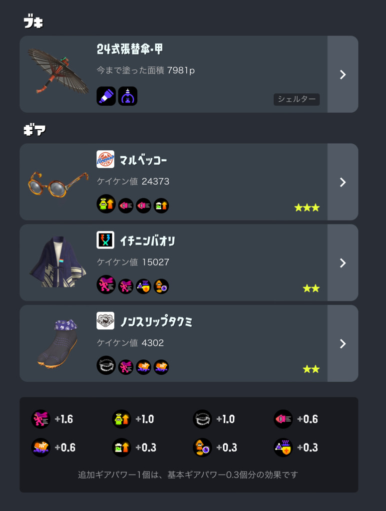 ギアパワーはメイン効率が大1個欲しいかな~って感じたくらいでまだピンと来てない とりあえずイカ速やヒト速積んでる イカニンジャとかも面白そうだよね