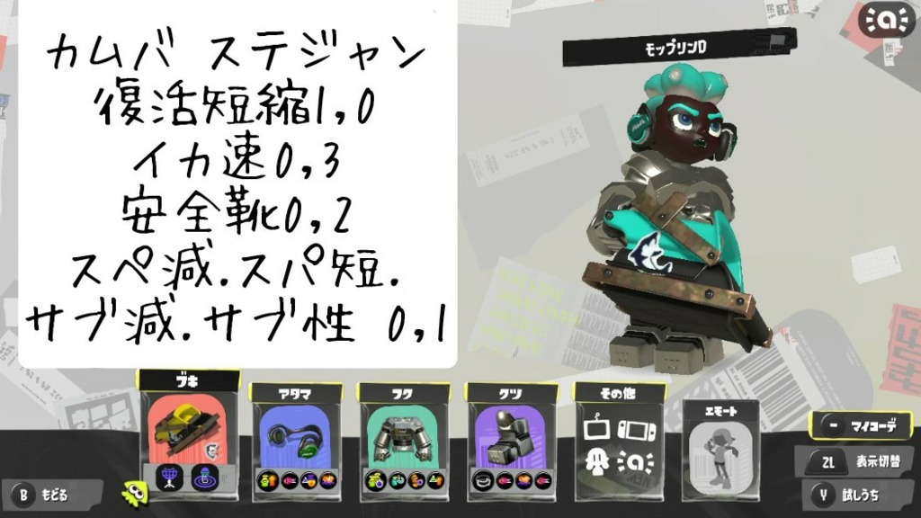 ビーコンがあるのでステジャンやゾンビの採用は諸説あるモプねぇ その枠にインク系やサブ性(移動系が苦しければそれも)を積み込むことでカムバとのシナジーも確保できるので、メインでしか戦えない武器である以上、カムバを使った計画的デスができるのならばゾンビは相性が悪いと個人的には思うぞ