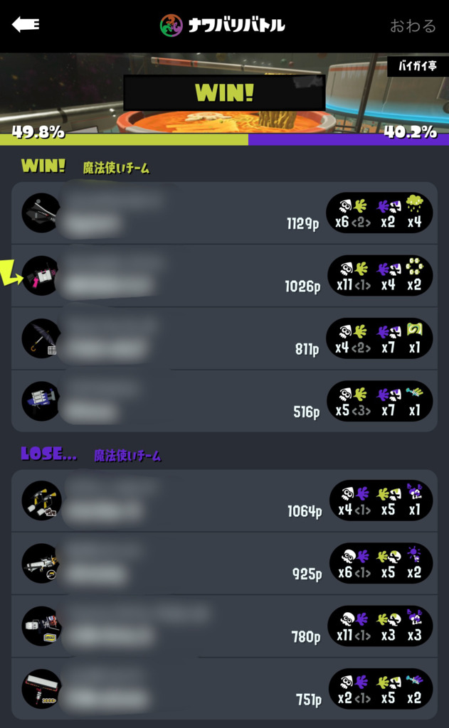 あとはラスト20秒で死者が多い方が負けの、ナワバリあるあるな試合が多かったように思います。