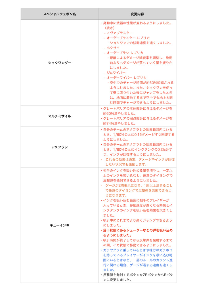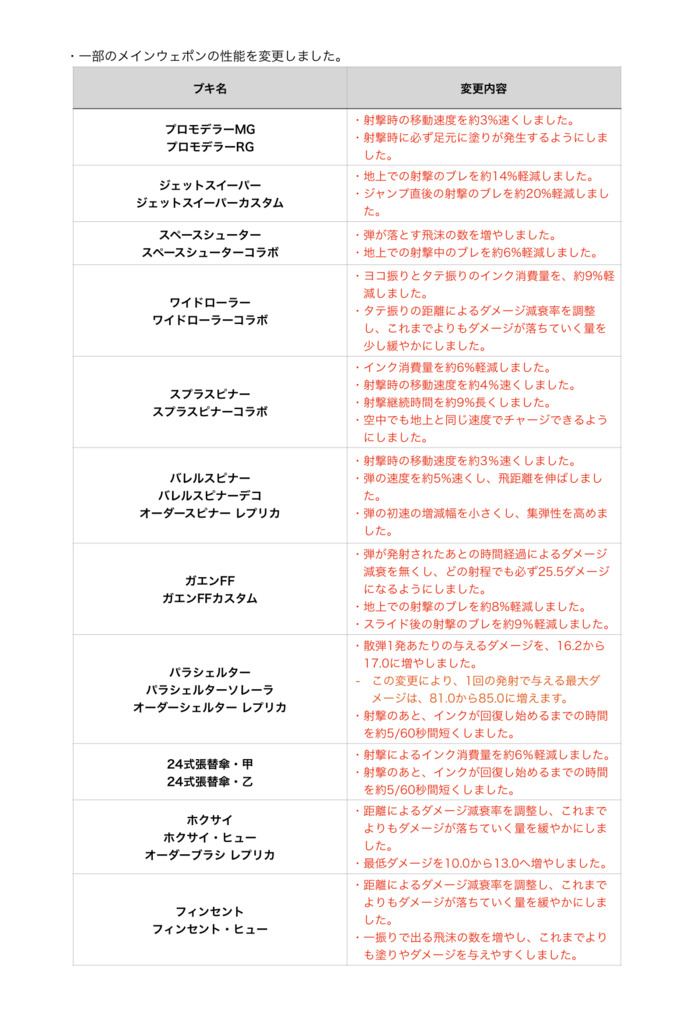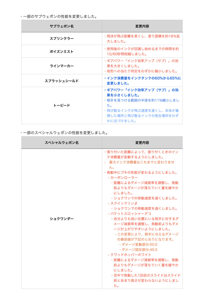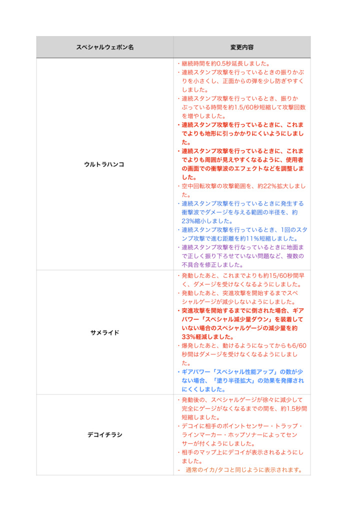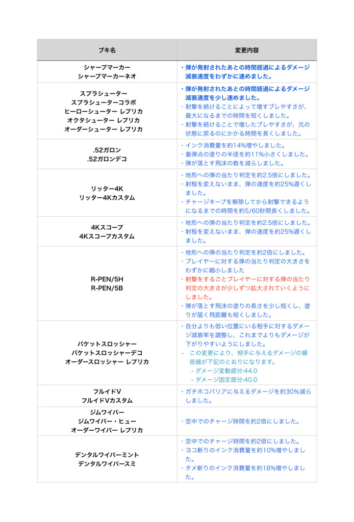 今年の初めに作った調整案の改訂版です。 強化案は赤色、弱体化案は青色、新たに追加したものは太字、不具合の修正は紫色、前回から調整内容が変化しているものは色の濃淡で示しています。 ※キューインキの黒色は、仕様変更のため、わざとこの色にしています。 明日、アプデ情報が公開されたら良いなぁなんて思っています。 ご意見していただけると、ありがたいです。 ※私怨も含まれていますが、構わず突っ込んでください。