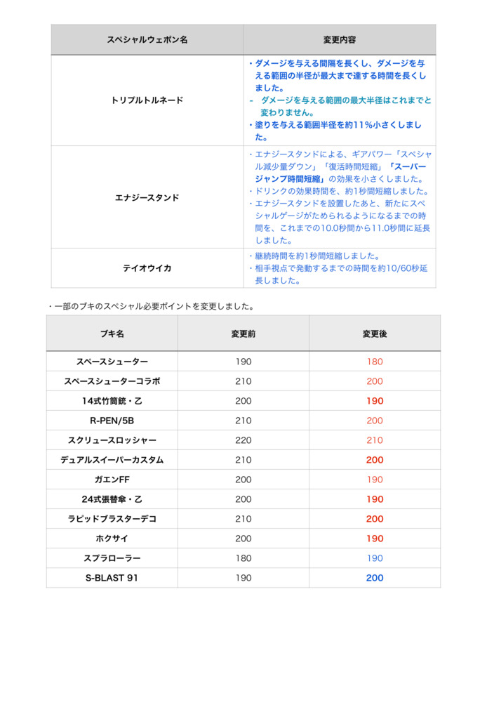 木主(別端末)です。 ウルトラハンコのコメント欄にて、「爆風範囲減らしてもいいから、狩られるのをどうにかしてほしい」というような意見をいくつか見かけたため、このような調整を行いました。 また、今回のスペシャルの調整は、「リスクとリターン」に重点を置いて調整を行いました。 ただ、その観点だと今回のナーフは少しやり過ぎかもしれません。 もう少し推敲し、どこかで公開を行います。