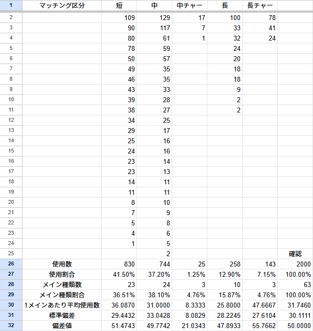 1メインあたり平均使用数と偏差値を見ることで、「そのマッチング区分には強いメインが多いのか、それとも貧弱なメインが多いのか」が評価できる
