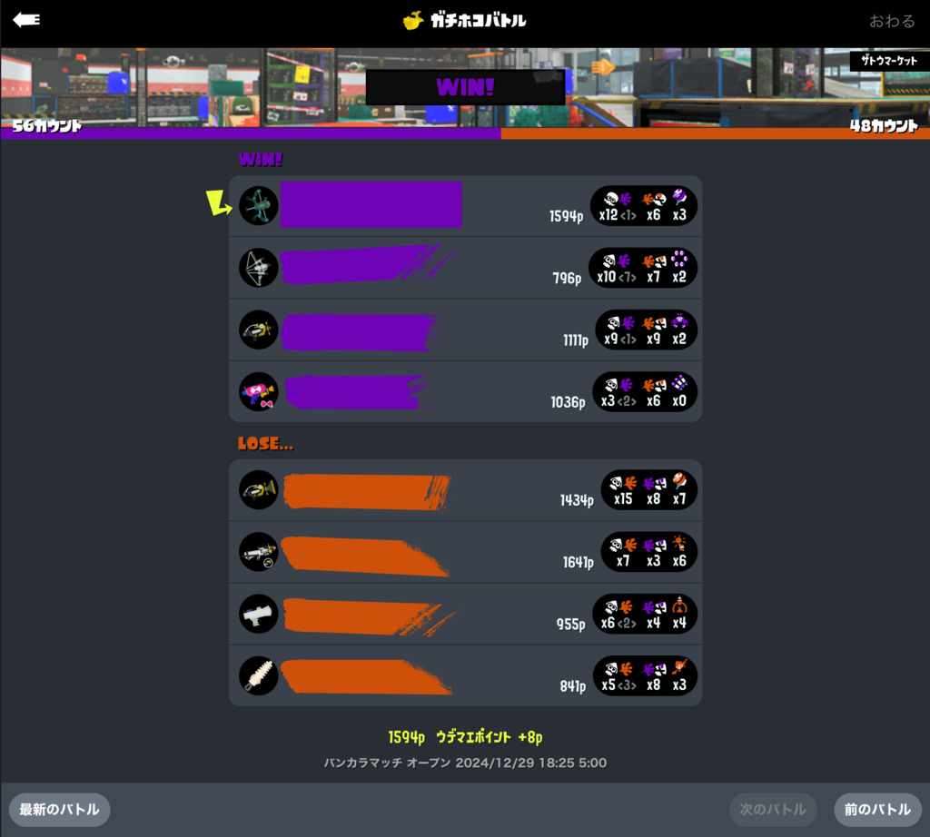 自チーム勝ってる状態で残り時間数秒、味方が自陣ホコ持ち帰りしたがやられて逆転負けという悲しいオチ