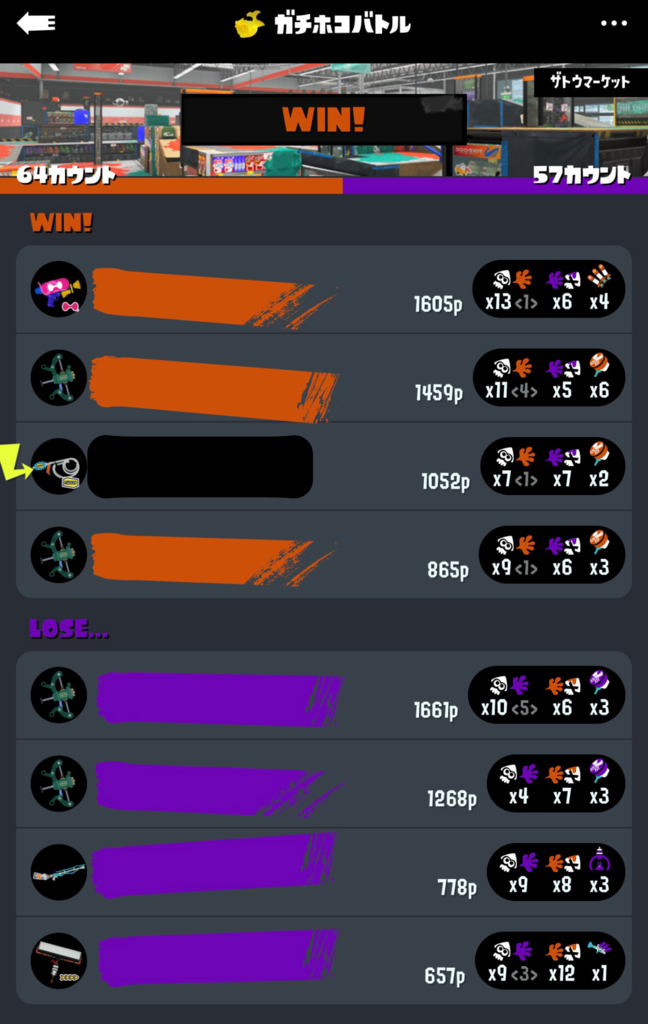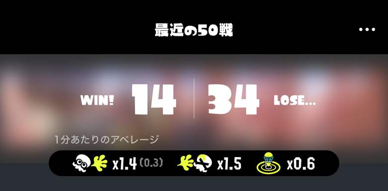 見るに堪えないほどボコボコに負けてリザルト見たらブキパワー1しか減らなかったんだけど…。