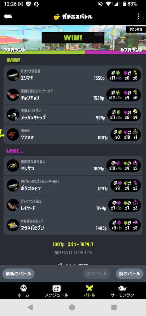 キルデスで判断はできないけど、K/D悪くて3冠、ガチアサリ運搬・注目ゲットあたりは敵陣営陽動なのでキルデス悪くても味方が動きやすくなってそう、という実感はある。ただ、ヤグラだと「来た、乗った、勝った」みたいな場合は残り3人がボコボコにしていたみたいなことも多くて。ルールにもよるけど、味方が強かったのでは?みたいな。ホコ運搬・ベストカウントもエスコートが手厚いとか。