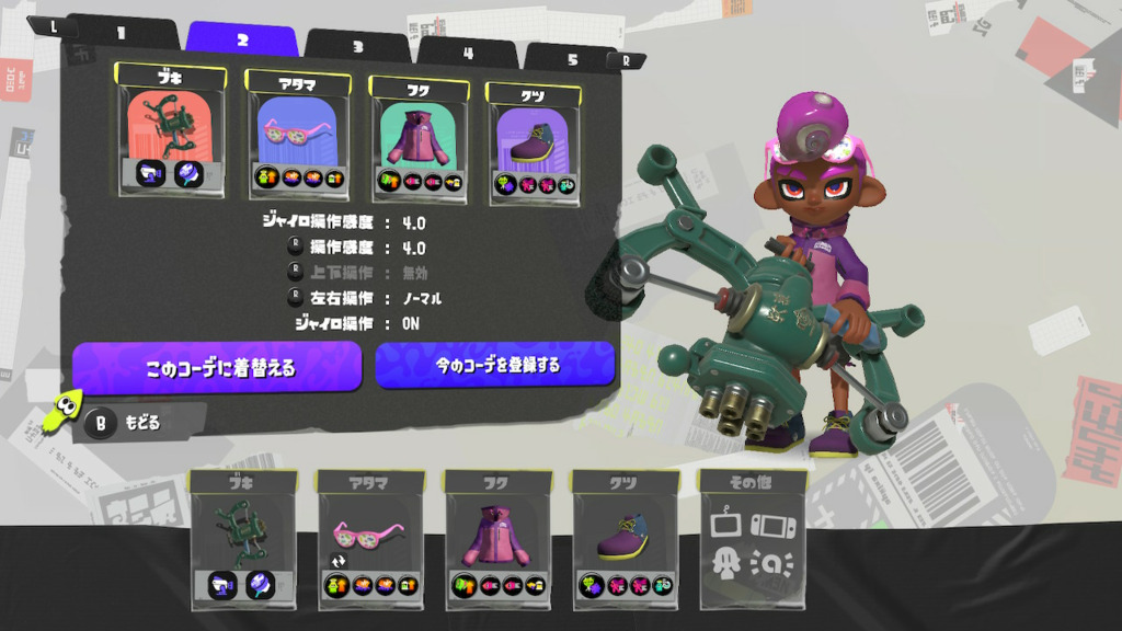 模索中だけど、必須に感じたのはスぺ性対物。使い始めたときに「もう少しハンコの自由度があれば」の瞬間が多かった分のでスぺ性は10積んだ。ほんとはステジャン履きたいけどシールド即破壊で相手(特に52ボトル)の攻めを封じる動きが強すぎる。 立ち位置コロコロ変えるときに回復するので今のところインク系は常用せず、スぺ増との圧縮もかねてカムバを採用、ステジャン吐かない分の復帰時間のケアも兼ねてる。 他はテキトーに移動系強化でいいやぐらいの感覚でつけてる。 あとこの癖強い見た目にどんなおしゃれしていいかわからん…いったん「田舎でおしゃれと言われてそうなコーデ」で紫統一にしたけど、もう少しかっこよくしてあげたいのでお勧めおしゃれ教えてください