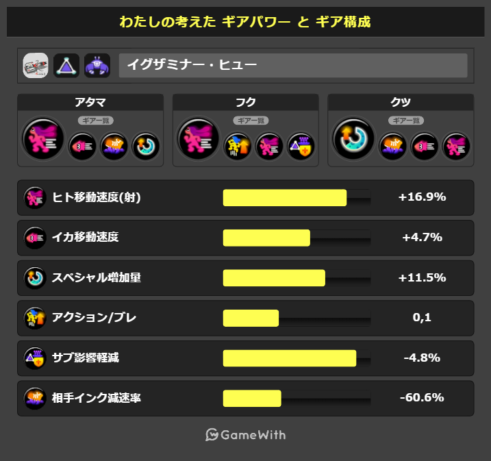 詳しいことはギアのページ見て自分で計算してほしいけど、メイン効率とサブ効率半々に積むのが一番効率が上がるのでは? イグザミナーより長射程とマッチングすること多いし、スプボでできること色々あるから多用することは普通だと思うよ