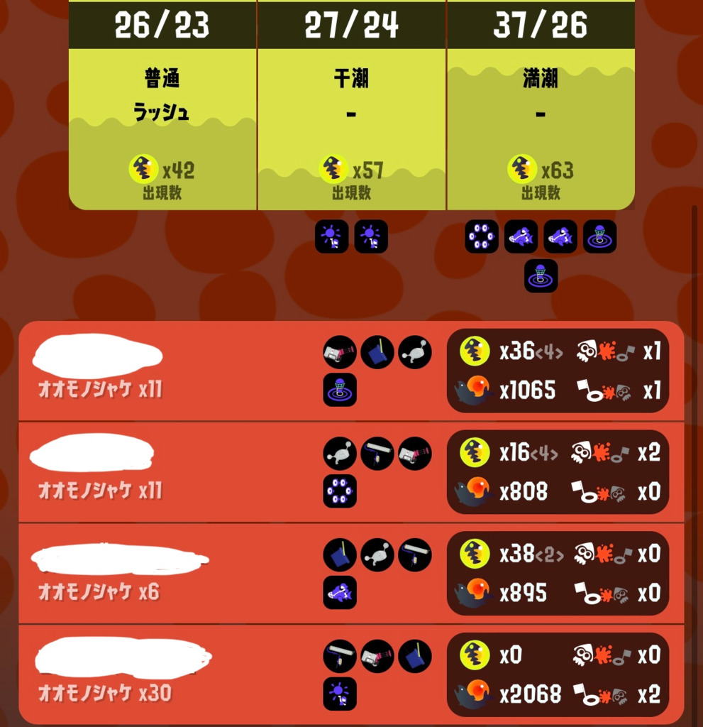 けど、その辺のレート帯で処理力ある人なら割と一生イクラ投げとザコ処理してたらクリアできる印象