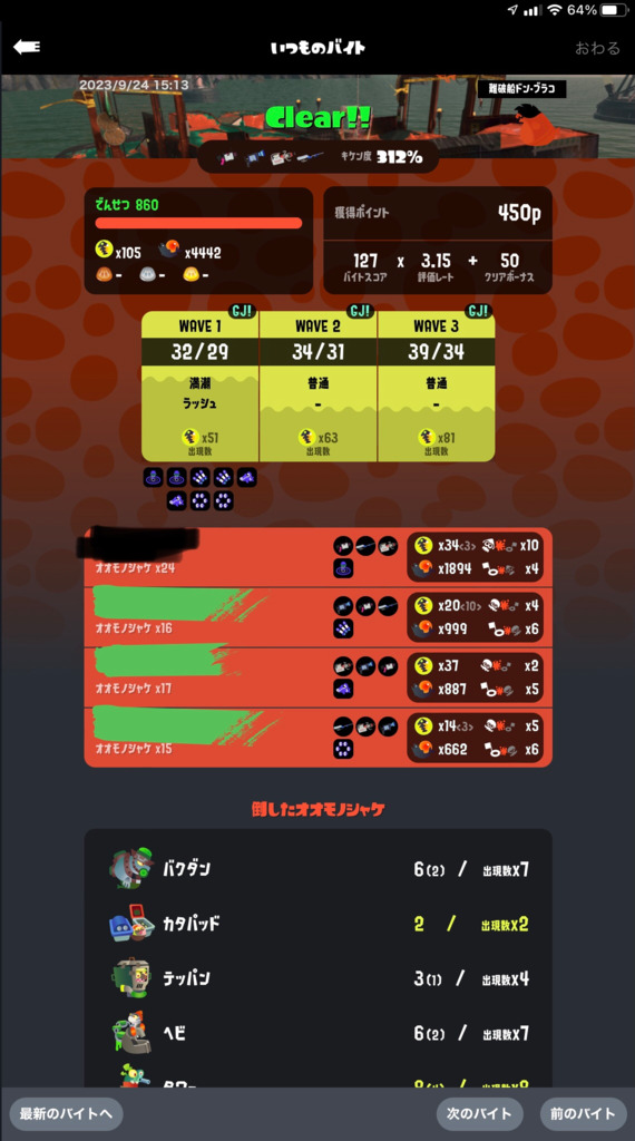 結構前のアルバイトでwaveの初めにテッキュウが出てきたからブキで倒そうと向かっていたら