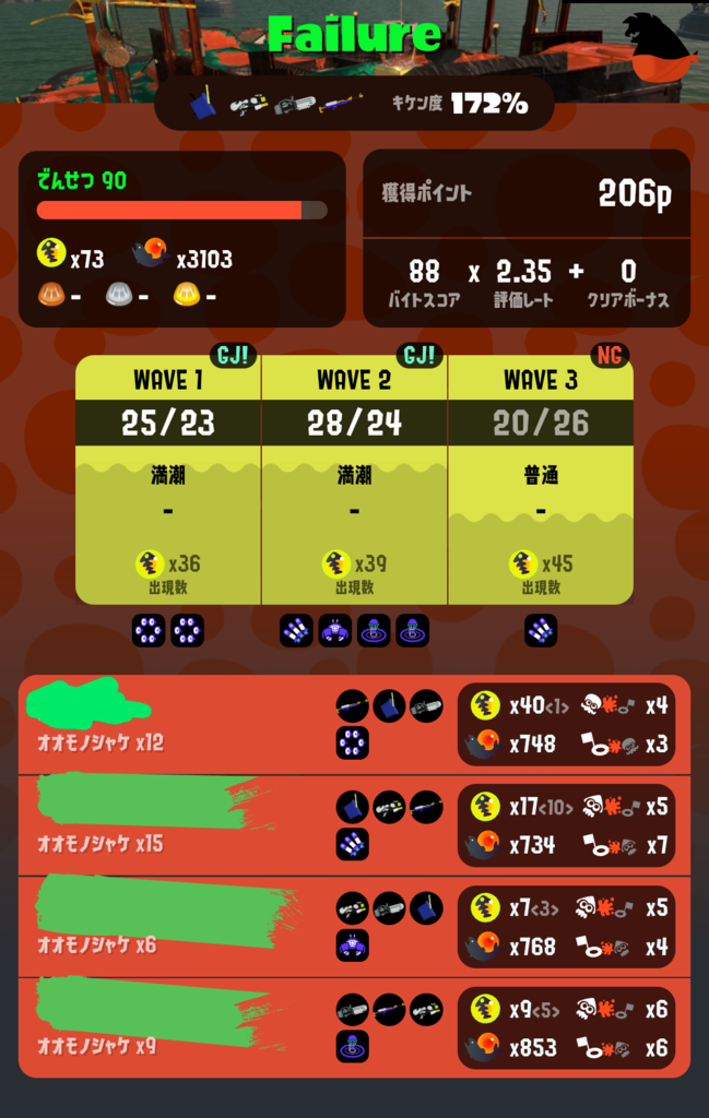 何がヤバいって、ハイドラで前衛倒せたところで後衛残ってるうえに納品進んでない&納品しづらいブキだからノルマが間に合わない