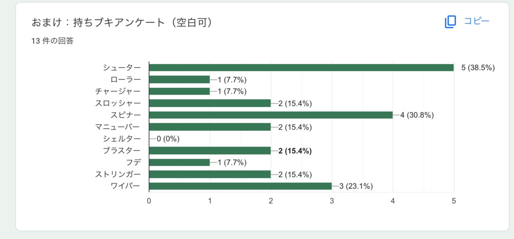 ヒラメが嫌われていました(主催もあまり好きじゃない)、参加者様には長射程短射程使いどちらもいらっしゃったかと思うのですが、もしかしたら壁塗りが結構時間かかるくせには、狭くて試合展開が結構早く進む点、押し込まれるとリスキルまで持ってかれるのが高い点などできついと思われているのかもしれません…特にどのルールが苦手か、どのルールをよくプレイする上で苦手と思うのか、そもそもどのブキ種を持っていると特にきつく感じるか…などをアンケートで取ってもいいのかもしれません(答えるのめんどくさくなりそうですが…) そもそもアンケート、ご協力してくださった皆様、誠にありがとうございます!全部埋められてたり簡素的に答えられてたり個性が出ていて大変興味深かったです。結果に書くのを忘れましたが苦手ブキで複数挙げられたのはリッターと52でした。自由記述欄にてお気遣いくださった方、ありがとうございます!また私怨や願望や一句などあり面白かったです。Googleフォームを初めて作ったため不備があり申し訳ございませんでした。 ペア杯はスペシャルを合わせたり今どっちがどうしようか…というのを考えられて結構好きだったりします。そしてなんとなく一番個人的に苦手だなと思うステージはやっぱチョウザメエリアですね、変に広いし坂だし抑えられたらきつい… 改めて皆様ありがとうございました!少しでもお役に立てたら何よりです!