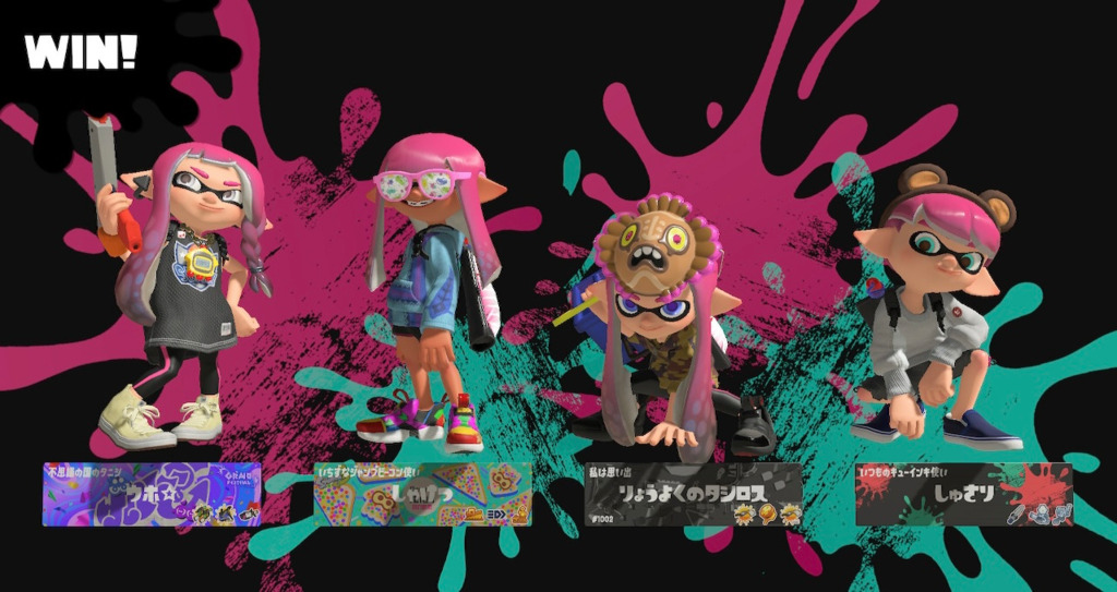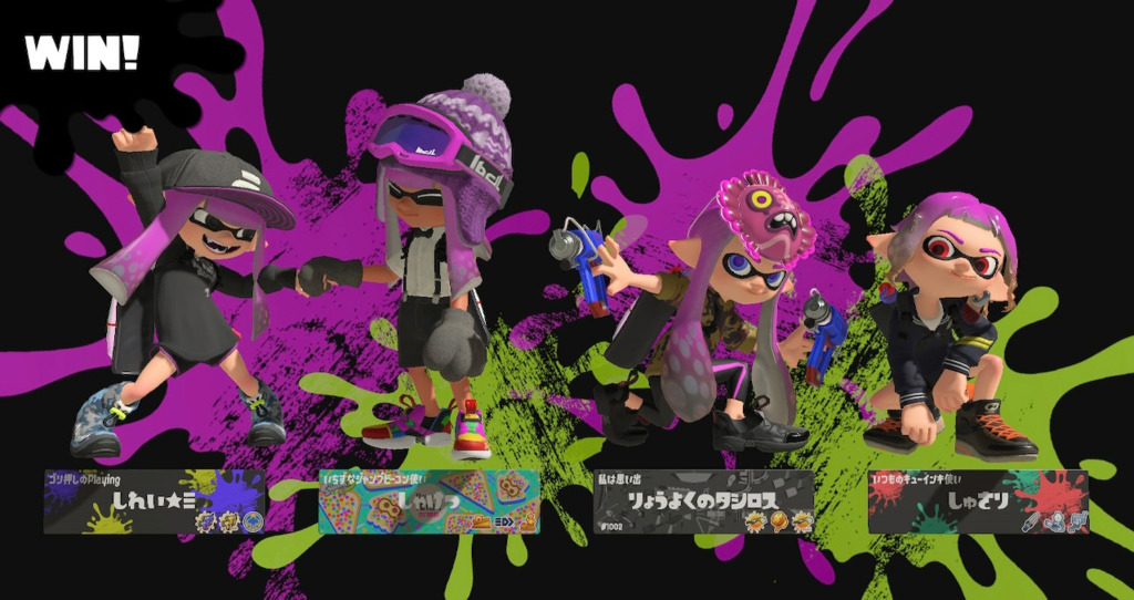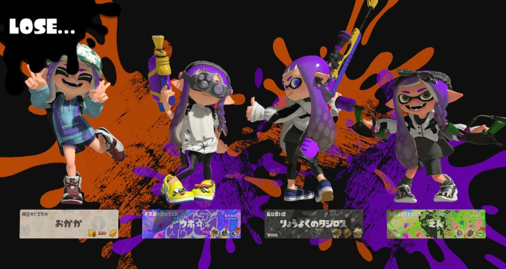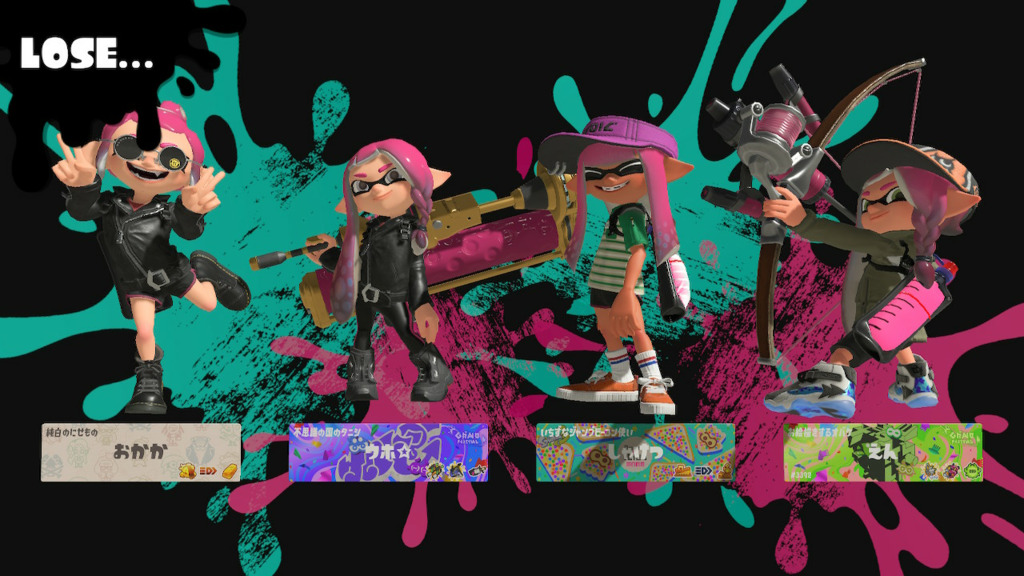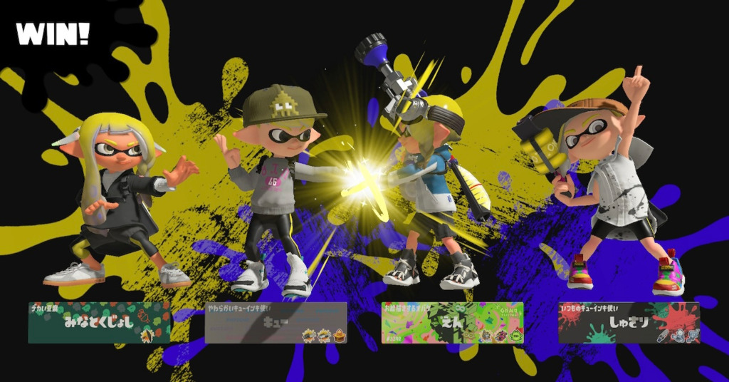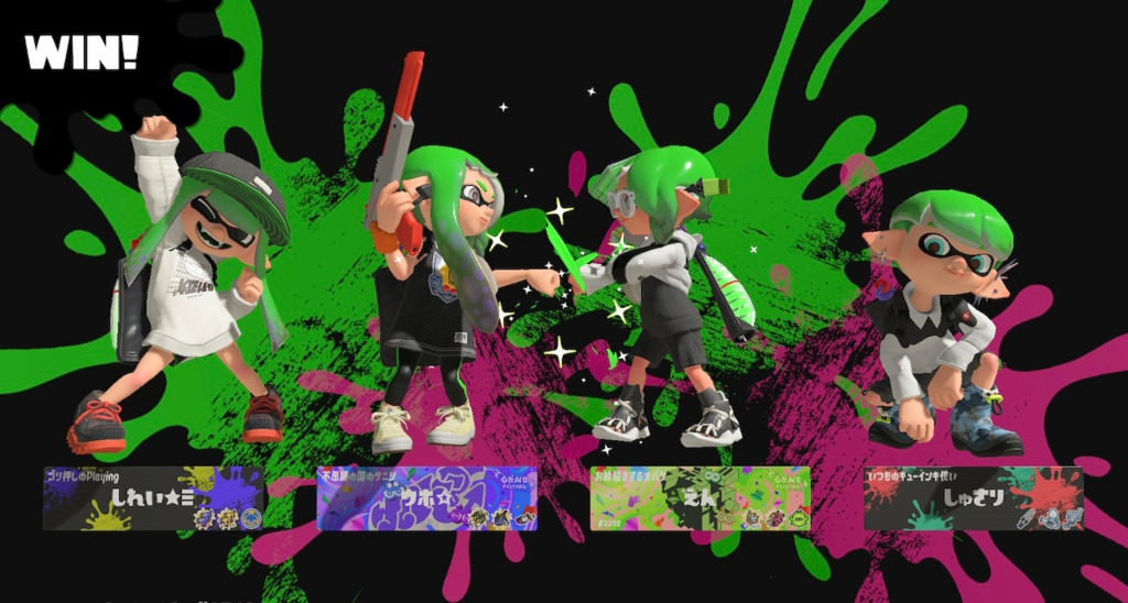 案外チームのブキのバランスは取れてるのではないか…と思いました(スペ統一やらブキ統一やらを除いて)、S4の主張がかなり激しかった気がします、リッカスコをたくさん使った方はマジでお疲れ様でした…でもやっぱギアパワーがもとのものと考えるとやべー子がちょいちょいいるのでなんでやろなぁ…思います サンサンサングラスくんのチームはナワバリで出たら大変だろうなぁ(笑)とか思いながら開催してたらガチで出やがってキューインキは切腹すべきだと思いました、正直出した責任で自分をアルファにしようかガチで迷いました 最新号にてデンタル使いが出たらしいので表更新を挟んだらワイパーが入ると思うのですが、スペシュやイグザミナーなどアプデで追加されていったブキもいっぱい出てくるといいな〜と思います、最近サイドオーダー編が終了したみたいなのですが、ヒロモ編がまだっぽい?のでまだXマッチの話とかイベマとかフェスとかはいつやるのかな〜と思ってます、これからの展開楽しみですね 原作でもバトルがあったのはブルーペラVSアセストップソシナでしたが気づいた人すげぇですね、正直そうだっけ?って一瞬なりました、ショッツルアサリでした ご参加くださった皆様!ありがとうございました!