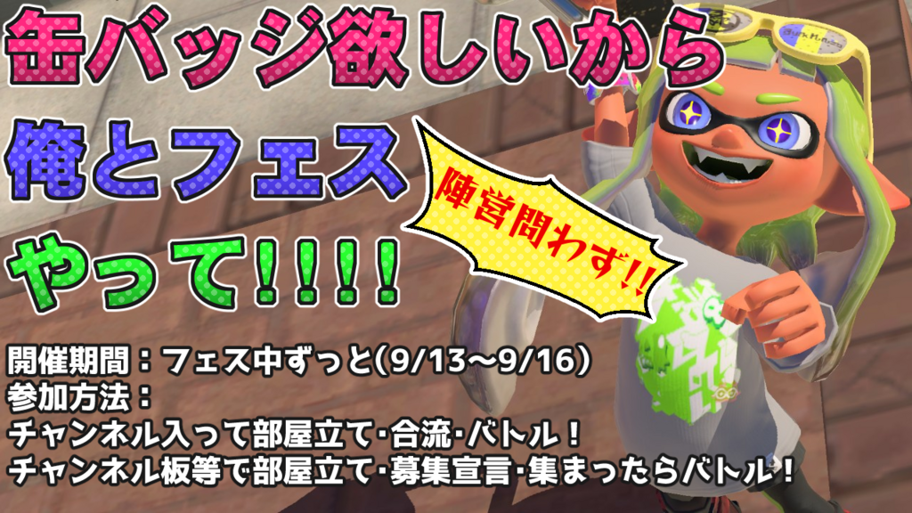 概要:フェスが近いのでギアパワー埋めを主目的として、せっかくなのでナワバリ、またはバンカラオープンを一緒にやってくださればなぁと思い、ゆる〜くやるものです。