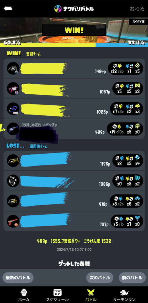 誰よりもデスするが誰よりもキルするゴリ押しスタイルで戦ってるけど、デスを気にしなければH3の性能は本当に頼りになるんだよな。とにかく出が早いしブレない フェスだからかナワバリ不慣れな相手だと4タテも決められた。まあ大体は8キル8デスみたいなスコアだけど、デス1みたいな日にはキル16とかなるくらいにはキルしやすいブキではある 普段はリベンジ付けてるけどやっぱりフェスで外れると圧力が減る気がする。青い爆弾みたいに思われたい