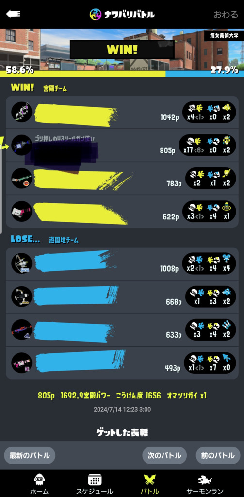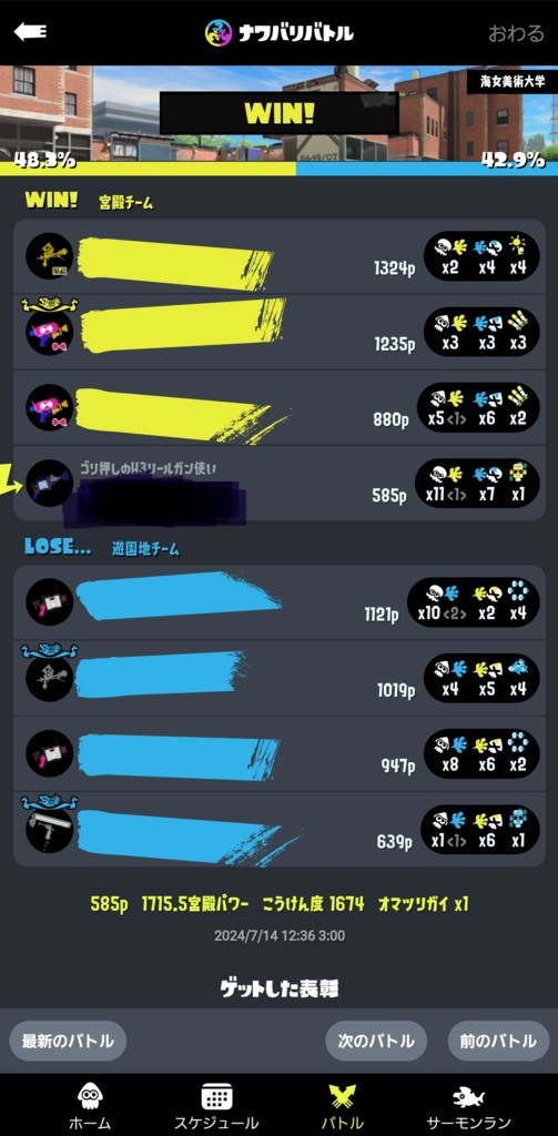 フェスだからかナワバリ不慣れな相手だと4タテも決められた。まあ大体は8キル8デスみたいなスコアだけど、デス1みたいな日にはキル16とかなるくらいにはキルしやすいブキではある