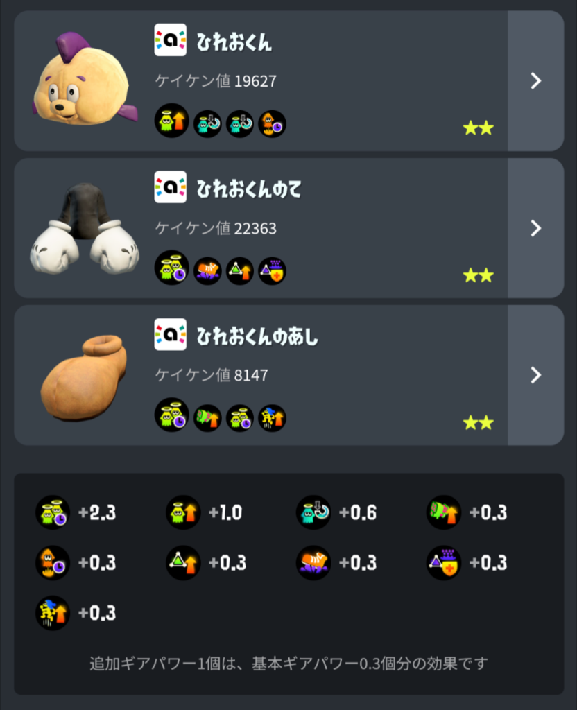 サブ性19と22の違いは好みの問題も大分大きいし、自分で実際にその両方で運用してみるのが実感としてわかりやすいと思うんだけど、ちょい手間なのは手間よね…カケラ的な意味で 自分のサ性のギアパワー数の判断基準は「撤退に間に合うか」が一番ウェイトとして大きいという前提で言うと、 自分は19でもいいかな~って思う 例えば10と19だと19なら間に合ったのに…は結構体感としてあるんだけど、19と22の差だったらスぺ性や靴を優先したいと判断するかな どちらかで一旦決めて、行き詰ったときに「ちょっと19→22(あるいは22→19)にしてみるか…」って変えてみるのも良いと思う サブ減は自分は妥協で外してるけど、「やっぱ無いと困る!動きにくい!」と木主が感じたら戻してね あとスぺ性については6って言っちゃったけど3でもいいってタイプもいるかも(3の増加数値が1秒、6が2秒)だから、色々実感と共に調整してみてもらえると