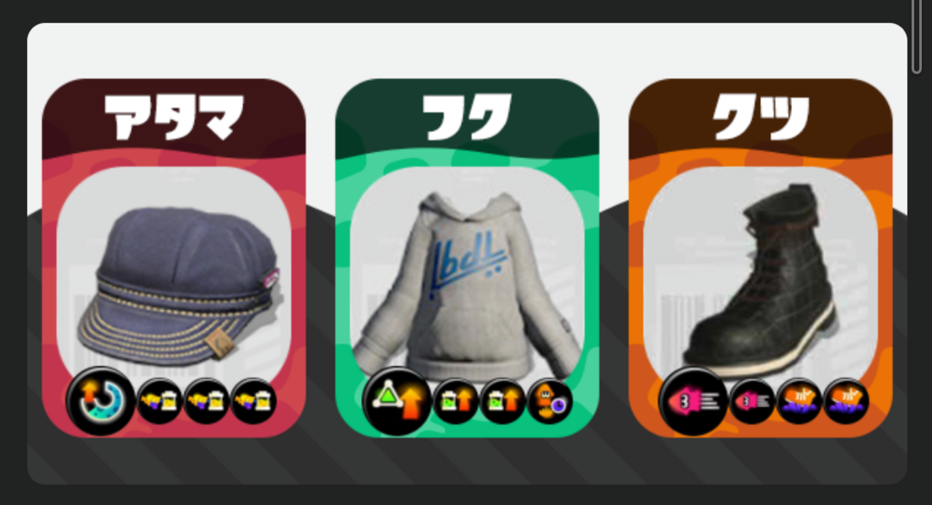 インク系のギアは、自分が手癖でプレイする中で試合を通して一度もインク不足のカチッが発生しない最低ライン。