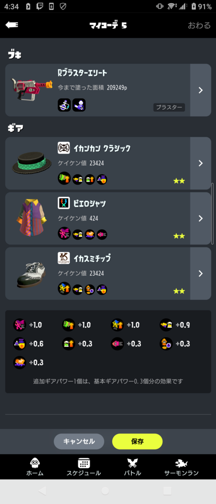 人によってイカ速減らしてサブ性能増やしたりするけど、ラピエリの基本はこんな感じだろう