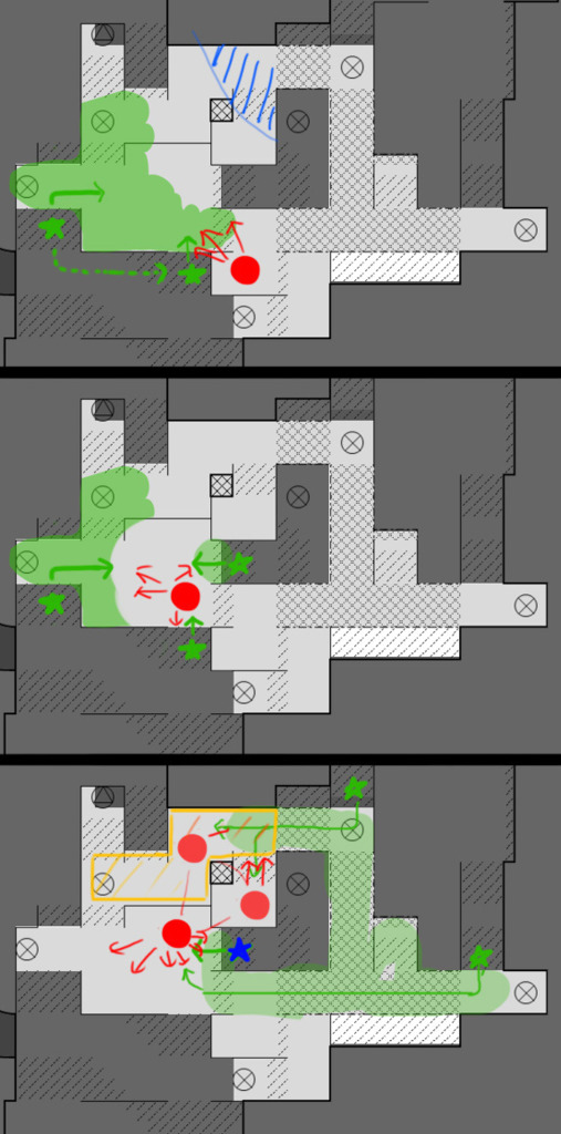 上図の湧きパターンが収まると大体反対にかわるのでその隙に前進して残党処理をし中央広場を完全に取る