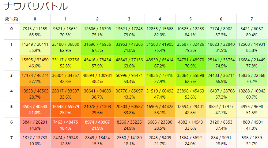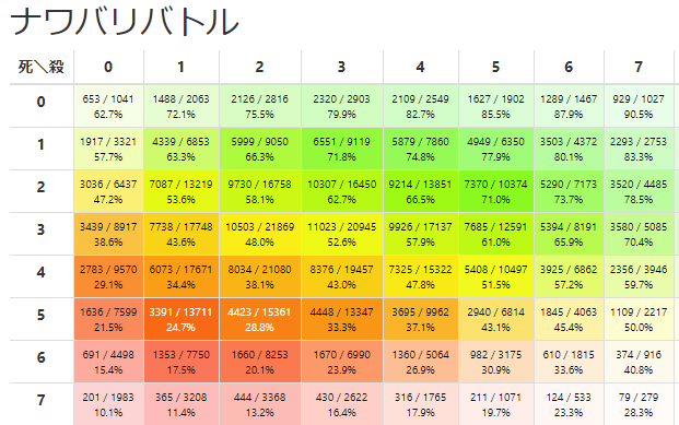 一応誤解のないように言っておくと「死にまくっても塗っていればOK」という意味ではない。デス数が少ない試合の勝率の高さは明らか。当然、そのデスを相手に押し付けるキルはとても重要だし大事。 ただ「1以上のキルゲー」というのはちょっと過大、ということは数字が示しているといいたかった。