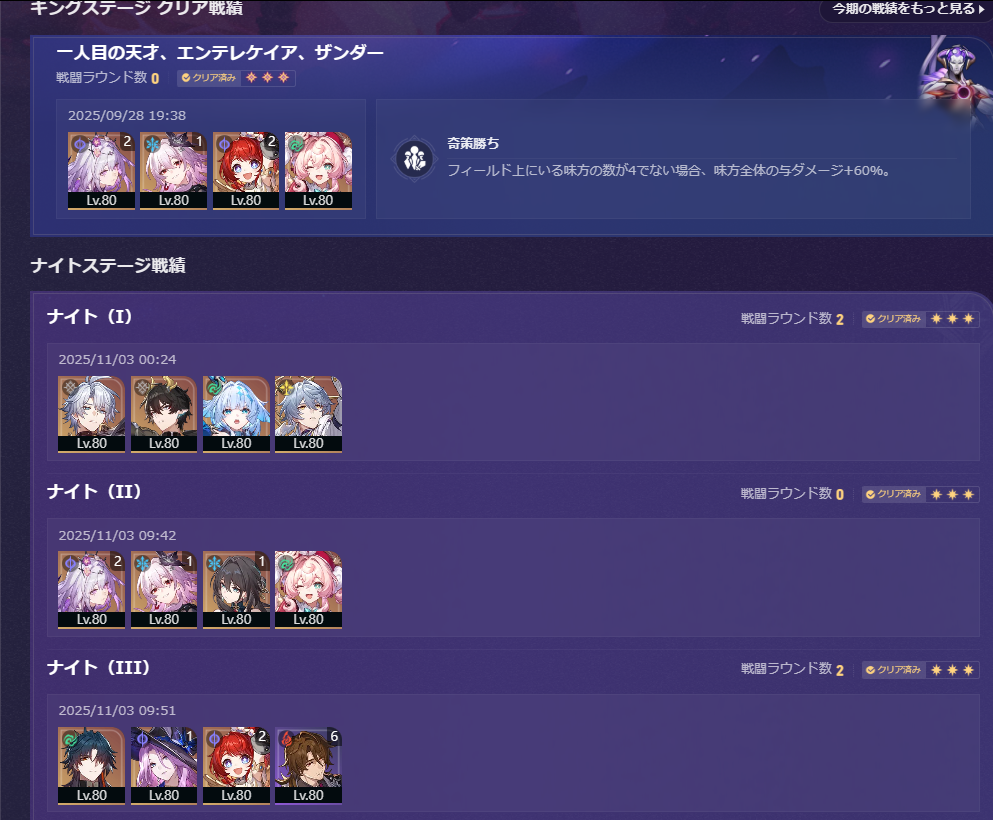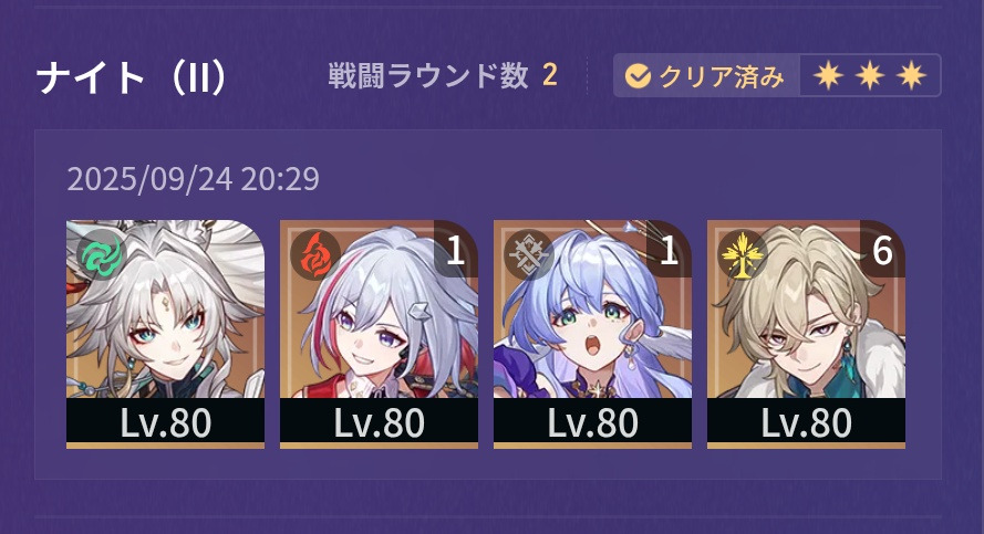 獲物セイレンス、クエストカフカ、ケツ汗銀狼、トレンド丹恒(全員無凸)でなんとかナイト2星3クリア。同袍をセイレンスにするのと丹恒を効果命中胴にした方がいいことに気付くのに時間がかかってしまった