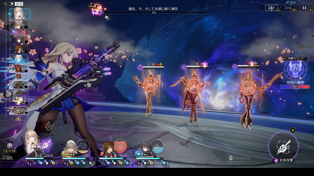 試したら、無凸餅アーチャー、無凸無餅花火、無凸無餅丹恒、完凸椒丘完凸サフェル餅で1Rクリアなら出来た。丹恒は入れた方がいい。自分は遺物厳選してなくて丹恒ウェンワだったから、ルサカならもっと楽できそう。記憶主人公の代わりに防御ダウンできるキャラ入れたらいいと思う。
