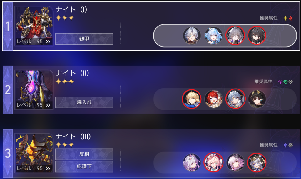 限定全キャラ無凸勢です。撃破も持続も持っていないので前半戦ではナイト星6だったんですが、色々と試行錯誤した結果なんとか星9取ることができました!同じ境遇で苦しんでいる人の参考に構成載せておきます!餅光円錐持ってるキャラは赤丸をつけてます。ルアン入りファイノンがナイト1にかなりハマってました。