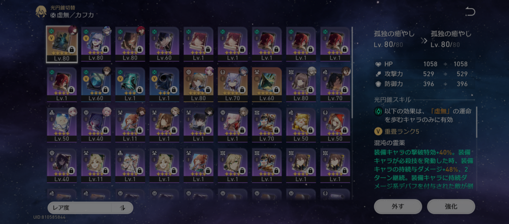 ありがとうございます。たしかに育成はつまみ食い状態です。軌跡遺物含め育成したと言えるのはカフカフゲン位で…鏡流のガチャが始まればそちらをひいてしまいそうですし(手に入るとは言っていない)。きちんと絞って育成したいと思います