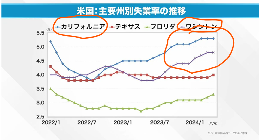 生成AIが「人間の負担を軽減する」という意味で最も貢献しているのが、プログラミングができる人材の首切りらしく、西海岸のカリフォルニア(Google・Apple・Meta・NVIDIA本社の所在地)とワシントン(Microsoft・Amazon本社の所在地)では順調に失業率が上昇しています