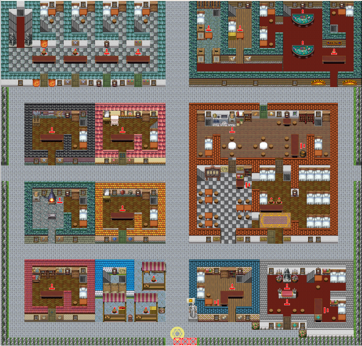 2023年10月4日現在でマイタウンに勧誘できる全ての職種…具体的には全種類の商店、鑑定、教会、転職神官、ギルド、宿屋、食堂、酒場、闘技場受け付け、教師、指南、魔法、奴隷商、闇市、カジノ、集合馬車全てをフォローできるよう全店舗を設置したマップです。適当に調整や改変して使って下さい。