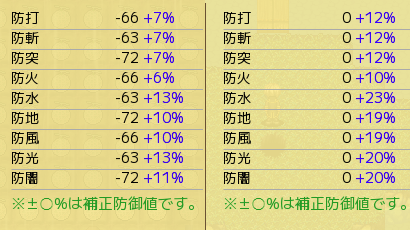 左が引継ぎ前の装備なしの耐性(徹夜の友使用)で、右が引継ぎ後の装備なしの耐性です。
