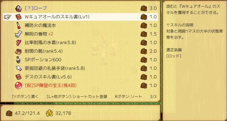 キュアオールはこの敵から入手可能(遺跡ボスの赤/金箱からも確認済み)、色違いはスキルリストにのってないので相伝から出るかはまだ分からない Wキュアオールは分からない多分箱から キュアオールはLv1しか存在しない理論値多分MP23