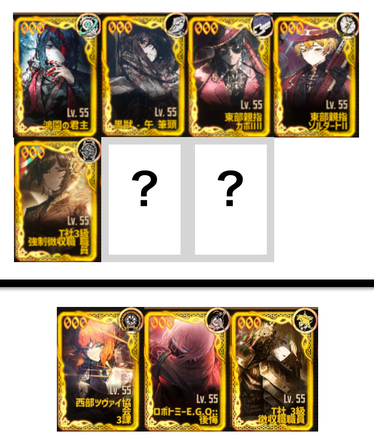 00も交えた破裂呼吸の7人で制約50を踏破。 隠しボスはレイホンを討伐。 編成順は①君主②LCCB良秀③ユーリファウ④センクムルソー⑤巳ロージャ⑥シチュ⑦巳おじ LCCB良秀とユーリファウは00ながらS3の最大マッチ威力に優れており、破裂呼吸ギフト適用の両立が可能な人格。 S3交換を重ねることで黒獣編成では達成できない7人全員が高いマッチ力を稼ぐことを目標の編成とした。 また、君主に切ない呼気を乗せた巳ロージャのS3を初手で誘発させる狙いもあった。 ※ユーリファウはS2を一つは残さないと呼吸人格で無くなるため注意。