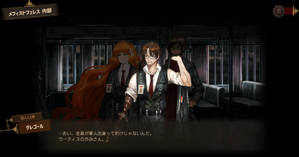 他者を演技することで共感を獲得していくのが4章ダンジョンの囚人たちだったが、ウーティスもそこは変わらなかった どこもかしこも不穏だがちゃんと年長の大人やってるから、逆に掴みどころが分からない(そこが魅力と言えるか