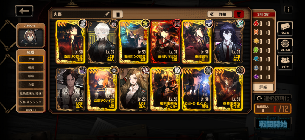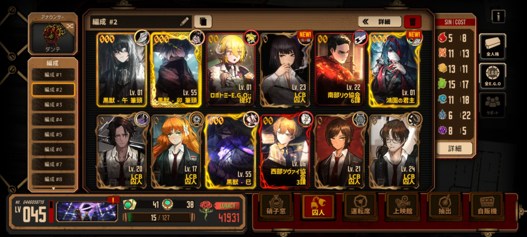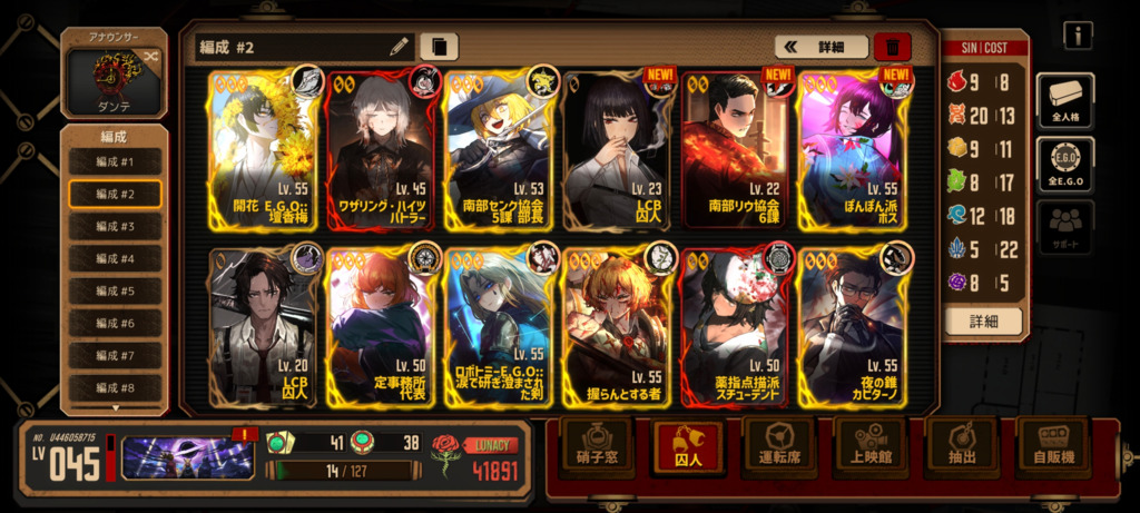 E.G.Oの方は粉砕される過去、空即是色、水袋、アルカナ・スレイブなど全体強E.G.Oが揃ってるんで同期さえ上げてしまえば大丈夫な気がしますが…人格がちょっと少ないですね