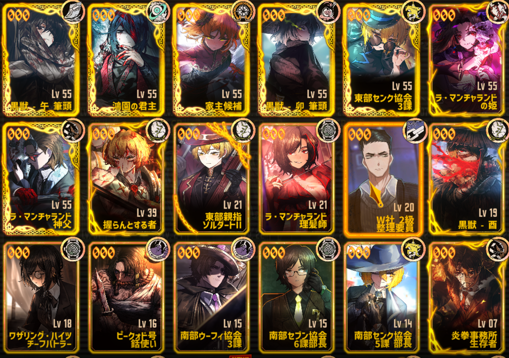 現状手持ち人格が黒獣ファウスト(レベル55)、君主ホンル/親指ムルソー/ツヴァイイシュ/黒獣、ヂェーヴィチロージャ/センク、握られるシンクレア/T社ウーティス/N社良秀(レベル50)