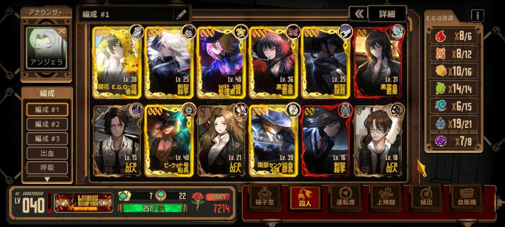 上のメンツで挑んだものの、傲慢資源が足りなかったりEGOを回避されたりで上手く行きませんでした。良ければアドバイスをいただきたいです