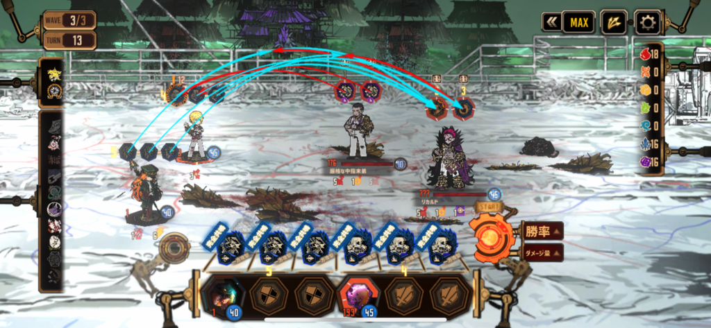 ちなみに負け筋は ①wave3開始時にウーティスがリカルドに集中砲火される ②イシュメールが混乱中で庇えないタイミングでウーティスが集中砲火を受ける の2つくらいで、それも確率的にはそこまで高くないので、まあ安定すると言っても良いと思う 低く見積もって70%くらいは勝てる印象。嫉妬脆弱だけど打撃耐性だから、リカルド以外なら1発2発はガードで受けるって選択も取れるし